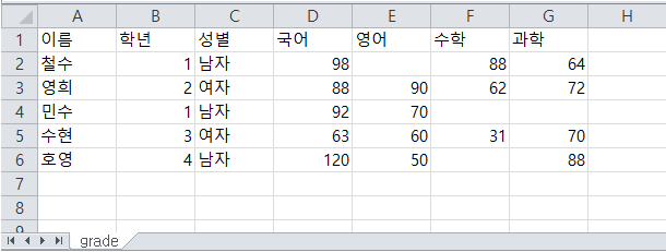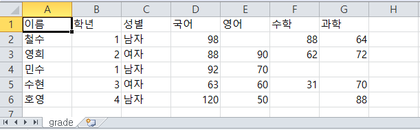 | 이름 | 학년 | 성별 | 국어 | 영어 | 수학 | 과학 | |
